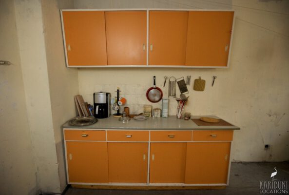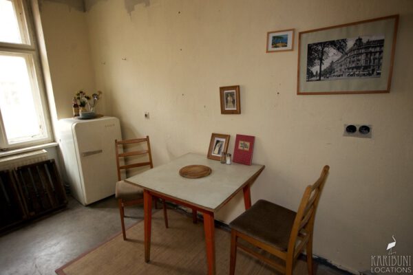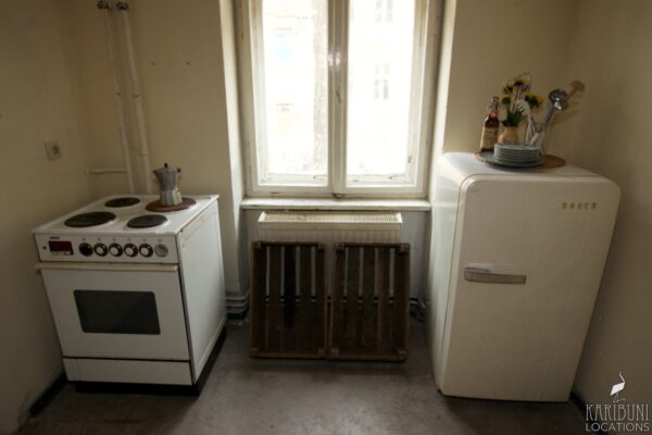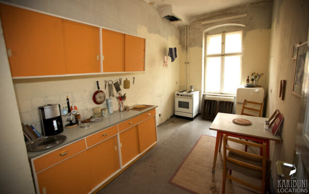 Eine schlichte, funktional eingerichtete Küche im Stil der 1960er-Jahre erinnert an den Alltag in Ost-Berlin. Blickfang ist das markante orange Sideboard, das zusammen mit dem passenden Hängeschrank einen nostalgischen Akzent setzt. Zur Ausstattung gehören ein Esstisch mit zwei Stühlen, ein alter Herd und ein Retro-Kühlschrank. Liebevolle Details und klassische Küchengeräte verleihen dem Raum seinen authentischen Charakter.