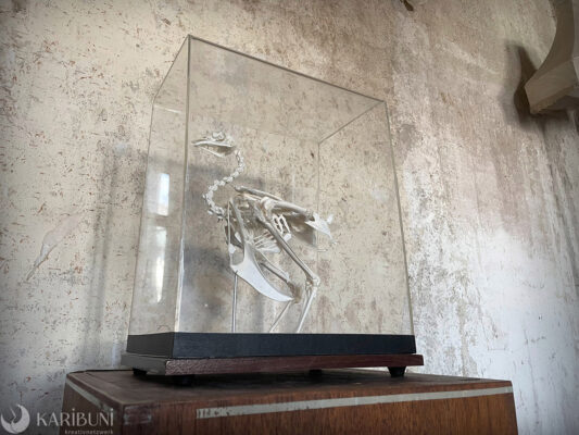 Das Arbeitszimmer mit aufwendig patinierten Wänden in zarten Blautönen strahlt eine nostalgische Atmosphäre aus – wie aus einer anderen Zeit. Hier könnte ein exzentrischer Wissenschaftler leben und arbeiten. Es ist ausgestattet mit Schreibtisch, zwei Bücherregalen, Röhrenfernseher, abgenutztem Lesesessel und einer umfangreichen Büchersammlung.